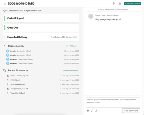 Quickly find everything you need to know about your shipment all in one place. Find departure and arrival times, manage notifications, documents, invoices, and more